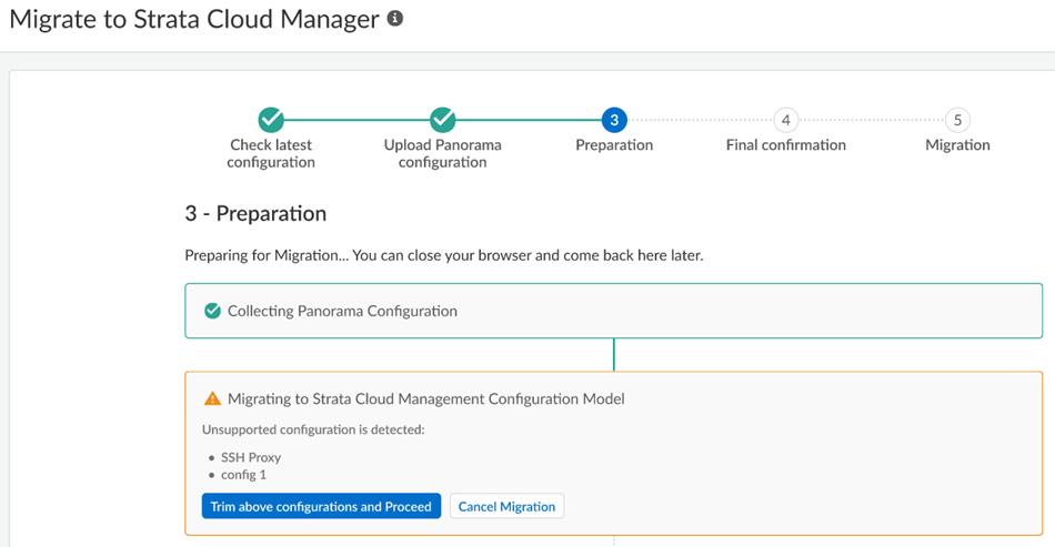 Complete Migration.While not required, you can also Acknowledge your changes.After you Complete Migration, you can't go back to a Panorama managed deployment and your deployment permanently uses Strata Cloud Manager for its management.