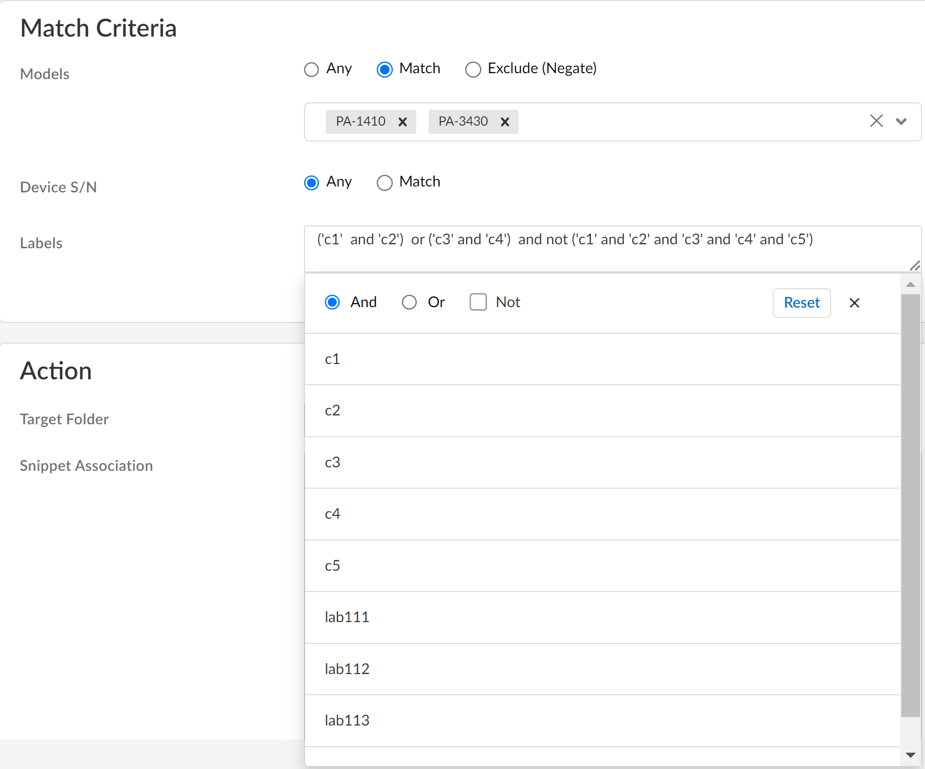For example, if you add PA-1410 and PA-3260, then the onboarding rule Action applies only to those Palo Alto Networks NGFW.