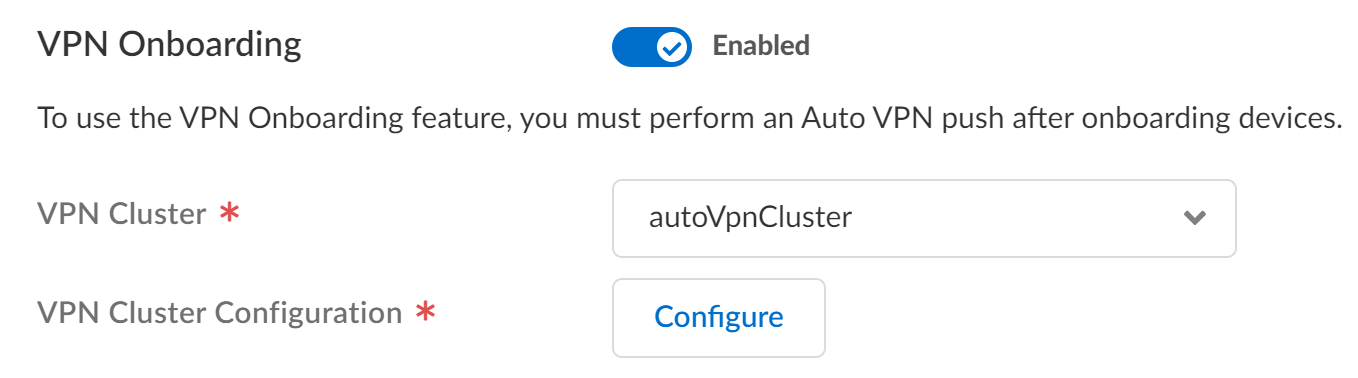 If enabled, select the VPN Cluster to add the firewall to. This determines the gateway devices and automatically creates secure connections between the configured gateway and the newly onboarded firewall.