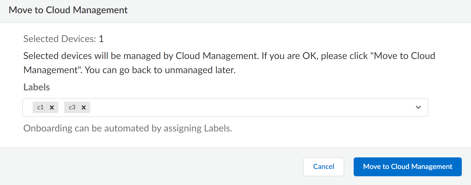 You are prompted to confirm the number of selected firewalls. Click Move to Cloud Management to continue.