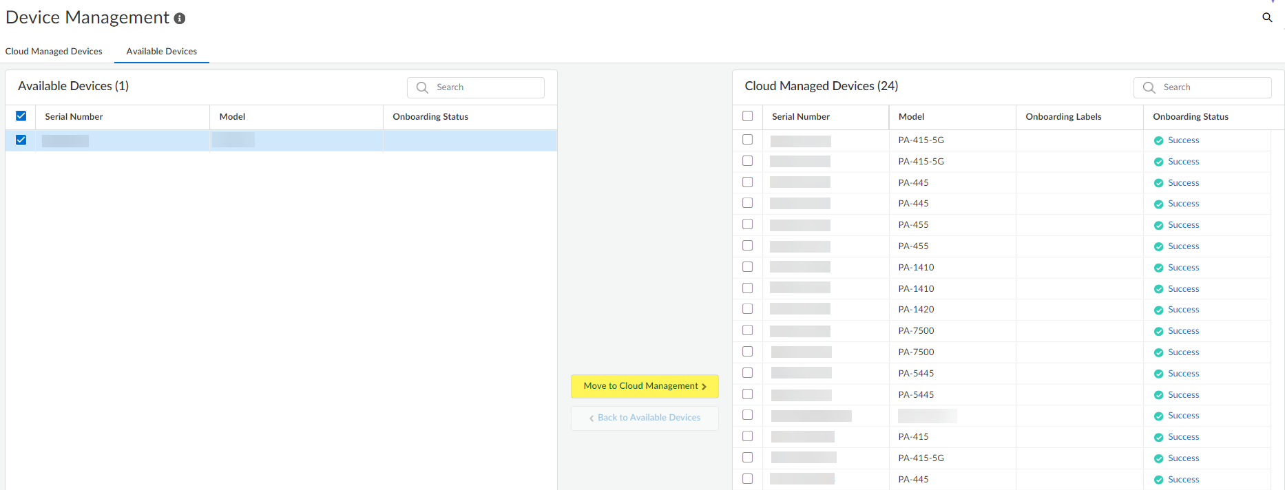 5. Confirm that the selected firewall is now listed in the list of Cloud Managed Devices and that the Onboarding Status shows Success.