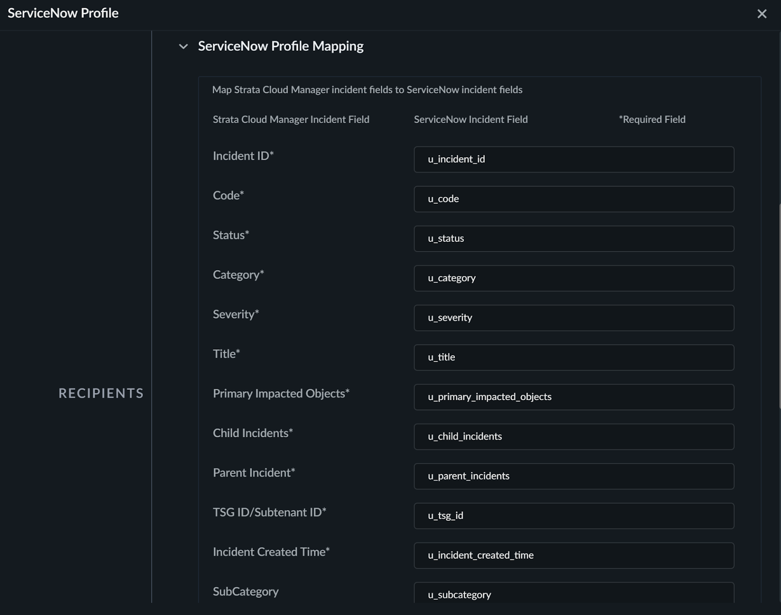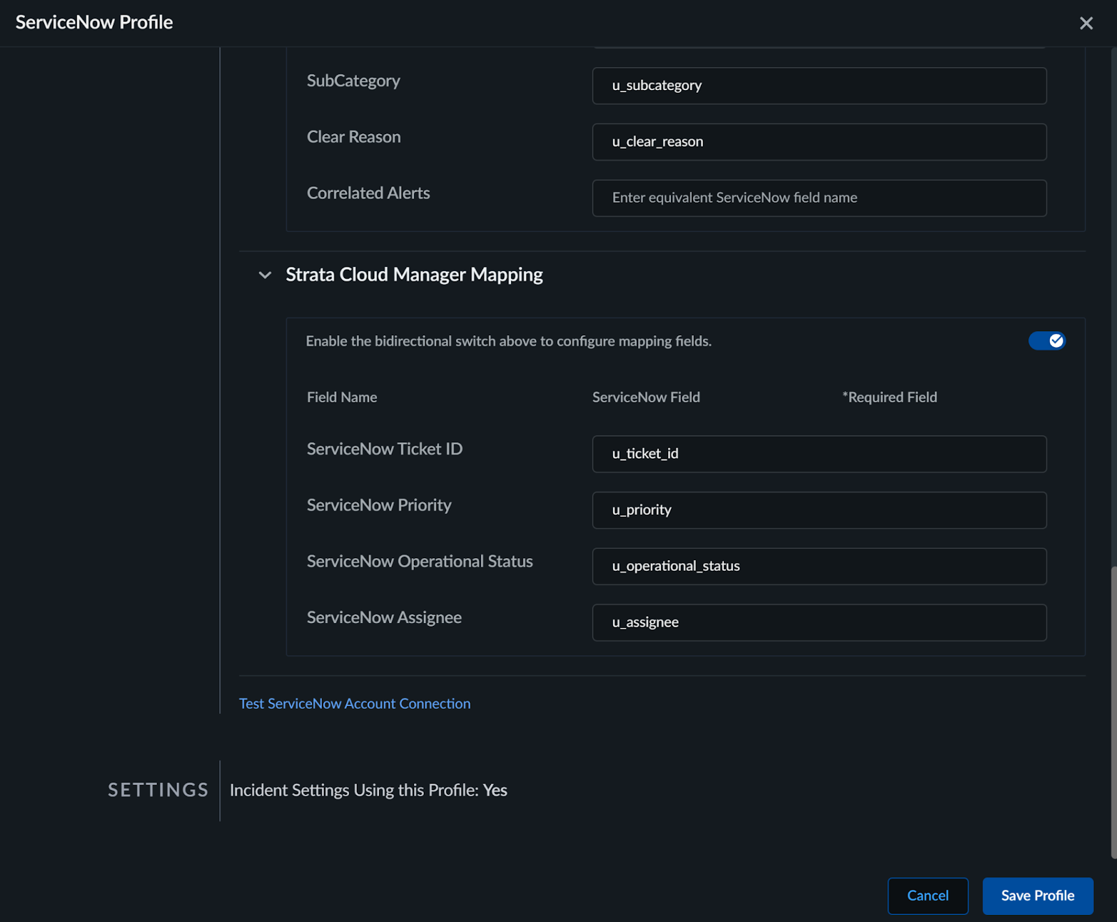 ServiceNow Mapping shows each Strata Cloud Manager Incident Field and
