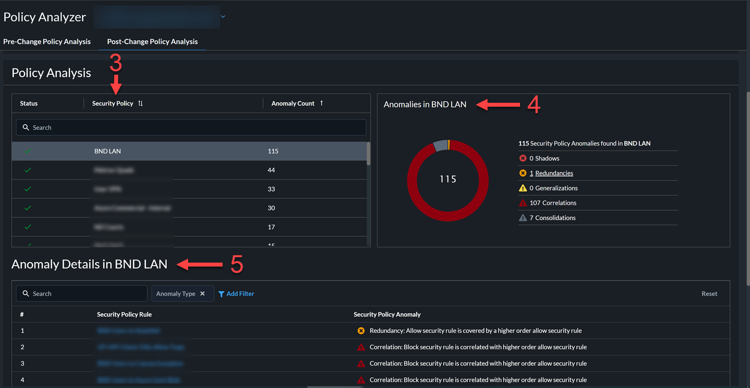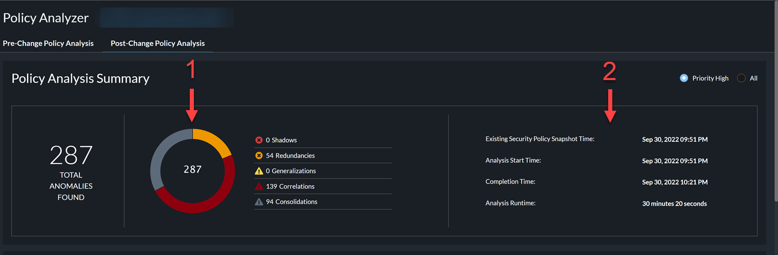 1. Shows the summary of the analysis across all the policy sets, that is, all the device groups with NGFWs directly assigned to them. You can view the anomalies or the anomalies based on high priority. The values in this report show the unique number of anomalies found in all the device groups. The colors in the chart indicate the different types of anomalies.