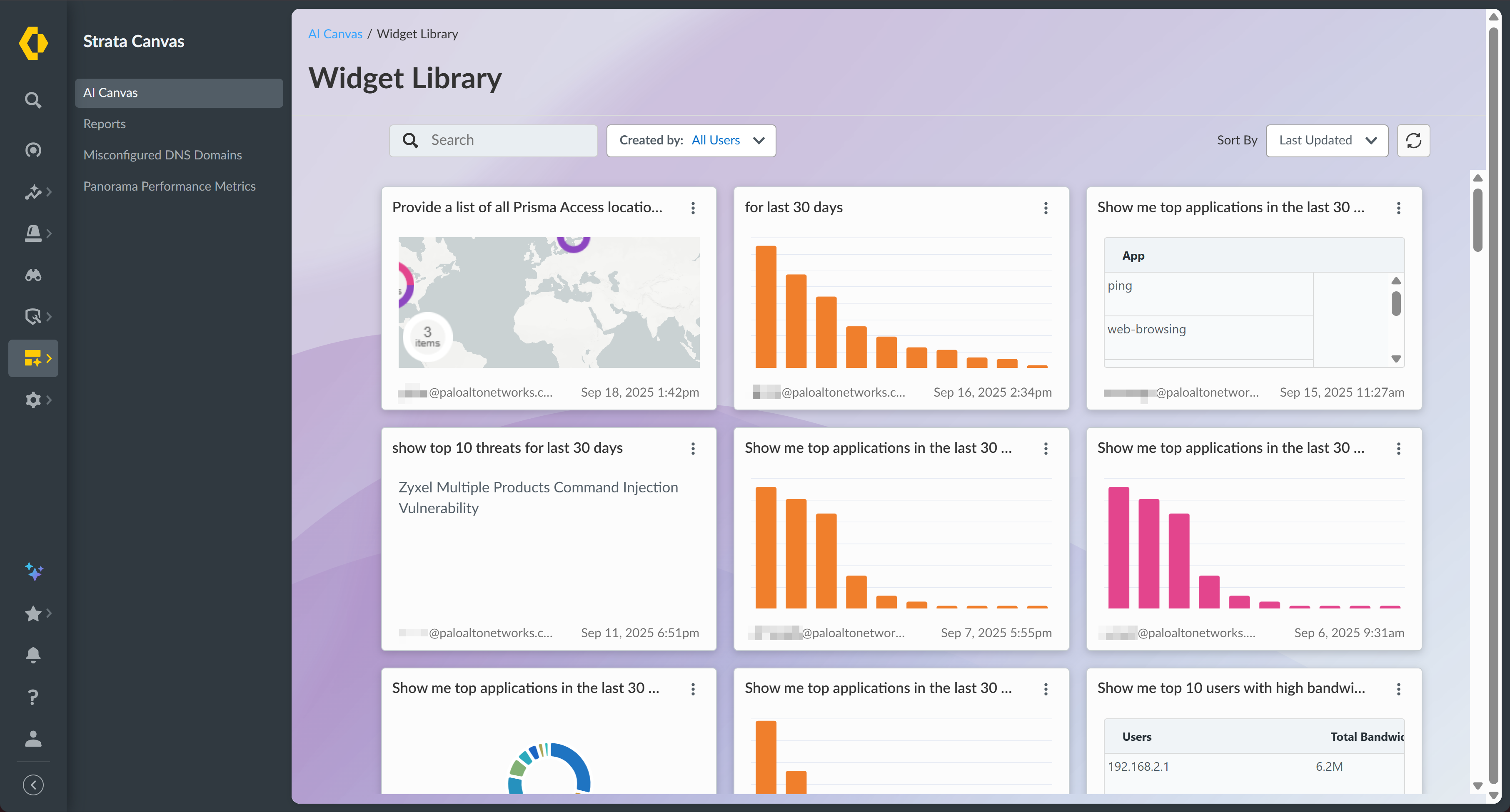 AI Canvas allows you to create and manage widgets that visualize your data. From AI Canvas, you can create new widgets and access your widget library for customization and organization.