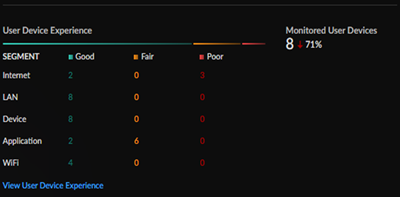 The Monitored User Devices and User Device Experience widget gives you a view into the total count of open incidents, the breakdown of good and potentially degraded user experience from individual segments in the service delivery chain from a user device to an application, and the change in open incidents from a selected time range.