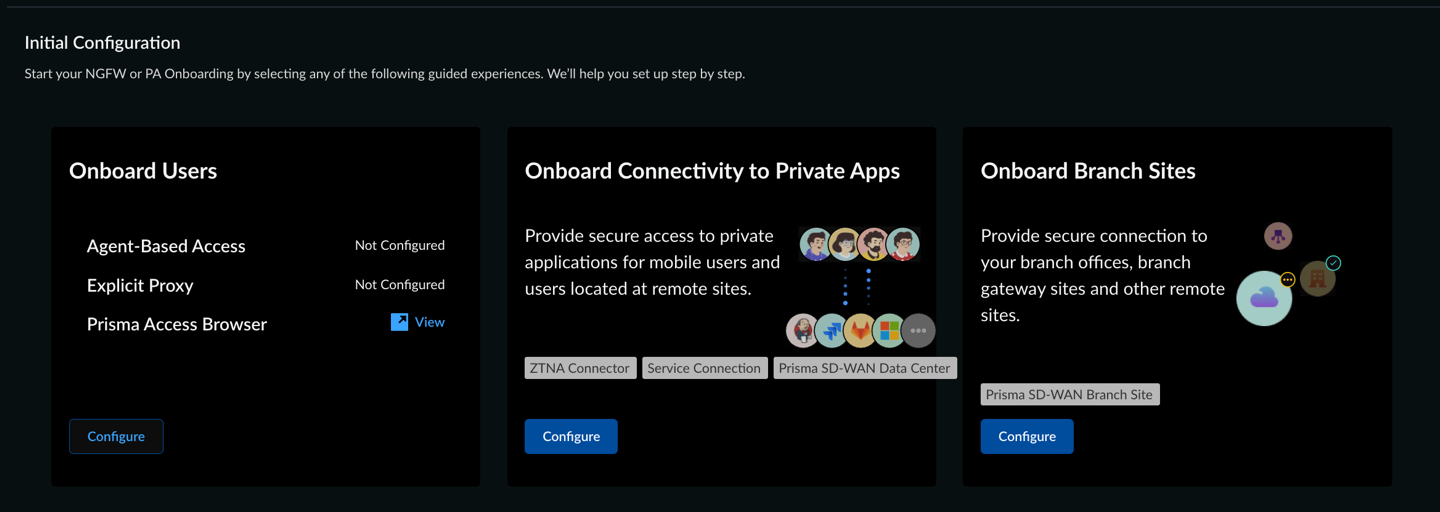 Go to ConfigurationOnboarding to get started with onboarding your Prima Access or NGFW