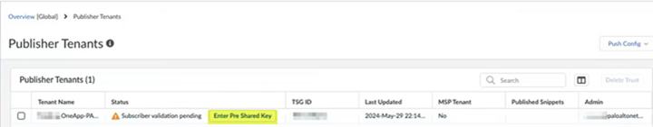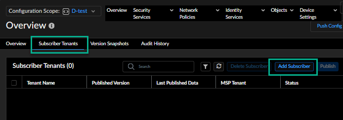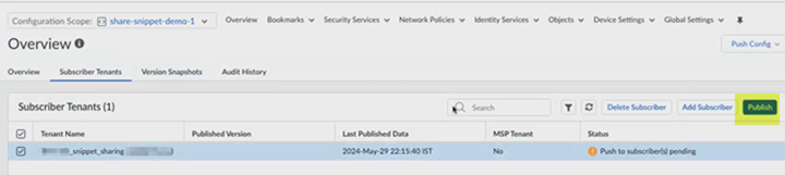 Go to subscriber tenant, select ConfigurationNGFW and Prisma AccessOverview and set the configuration scope to Global.- The Publisher Tenants status under