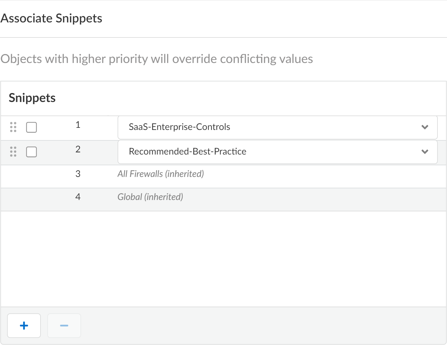 Associate a snippet.- Select ConfigurationNGFW and Prisma AccessOverview and expand the Configuration Scope to view the Config Tree.Select the folder, deployment, or device you want to associate the snippet with.Edit the Config Snippet.Add the snippets that you want to associate and order them as needed.If you're associating a snippet to the global scope, it becomes referenceable and available to all the other snippets in the configuration. All the snippets will be able to reference the objects you have in the snippet attached to the global folder.