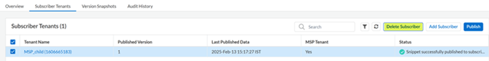 To delete a subscribed snippet, select the Tenant Name and Delete Subscriber.The deleted subscriber tenant will be removed and will not appear under Subscribed.