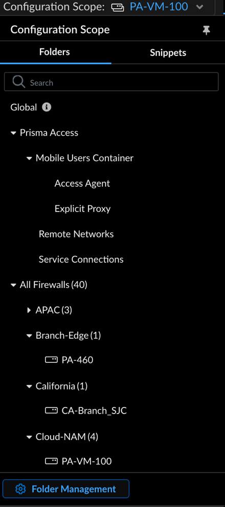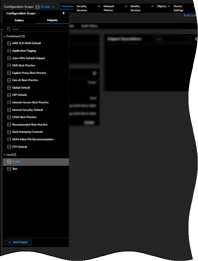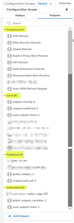 - Log in to Strata Cloud Manager.Select ConfigurationNGFW and Prisma AccessOverview and expand the Configuration Scope to view the Snippets.