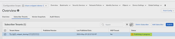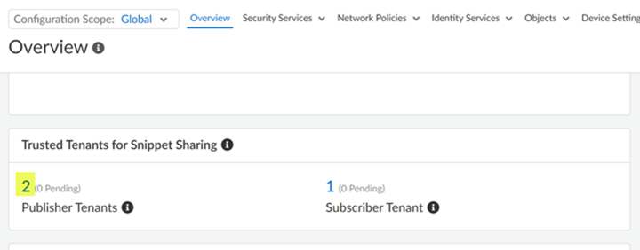 This feature provides a unique and flexible method for sharing common configurations across any tenants including in a multitenant environment. You can save and manage various configurations as snippets, easily sharing them across tenants under a customer account. This capability provides considerable flexibility and control in managing shared configurations across different tenant environments.Additionally, this feature supports centralizing configuration management for common scenarios among tenants and overseeing global configurations within a multibusiness unit setup.In this framework, the publisher tenant shares snippets with the subscriber tenant, while the subscriber tenant receives snippets from the publisher tenant.- Log in to Strata Cloud Manager.On the publisher tenant, select ConfigurationNGFW and Prisma AccessOverview, select the Global configuration scope.Establish Trust Between the Tenants: Establish a connection between the subscriber and publisher tenants to enable the sharing of snippets.