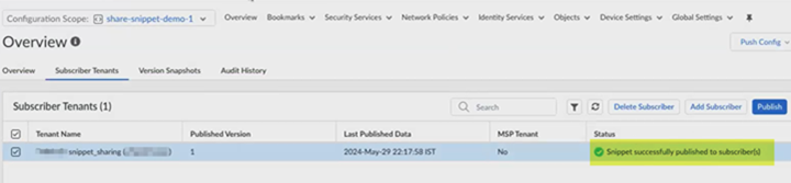 The Status column shows Snippet Successfully Published to Subscriber Tenant.