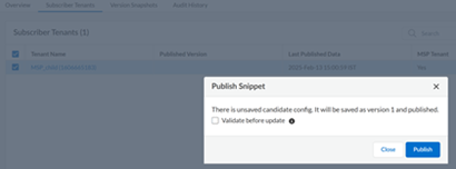 Subscribed snippets.You're redirected to the snippet Overview which shows details such as the publisher tenant's name, description, TSG ID, snippet creation time, last updated time, labels, and pause update details.With pause update enabled, user has the option to Validate Before Update on Publisher before loading the latest version.
