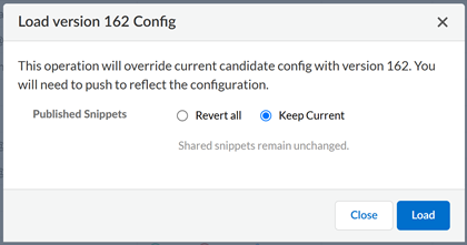 - Load – Load an earlier version as your candidate configuration in Strata Cloud Manager. Your current candidate configuration will be lost when an older configuration is loaded.Make updates to the new candidate configuration or apply the configuration to new devices and deployments outside of the original configuration snapshot, and, when you’re ready, Push Config.