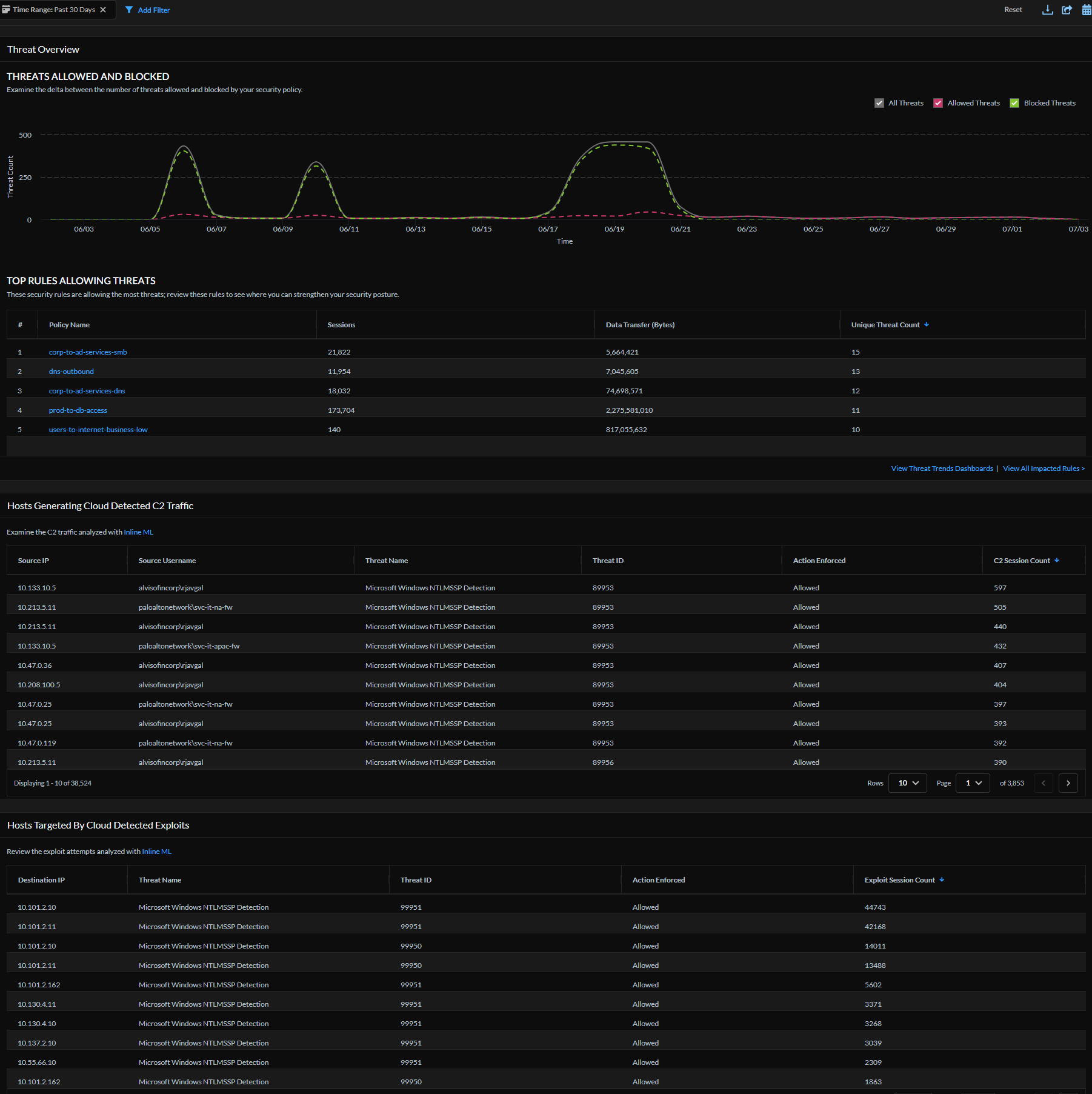 dashboard provides a timeline view of threats allowed and blocked and a list of