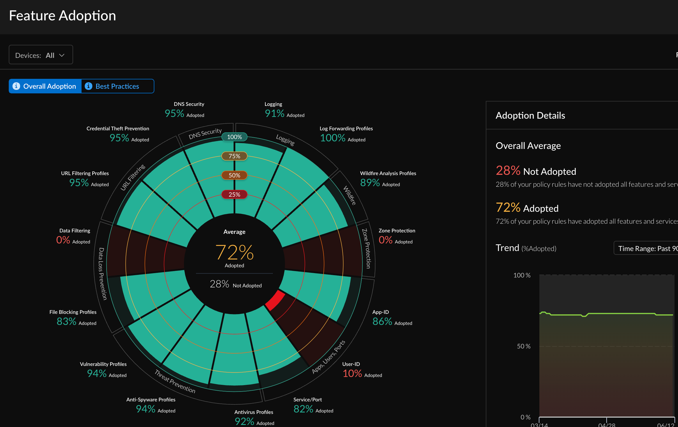 - To focus on the feature adoption for a specific set of firewalls, you can filter the chart based on device group, including Panorama-managed devices. You can also see historical adoption trend charts.