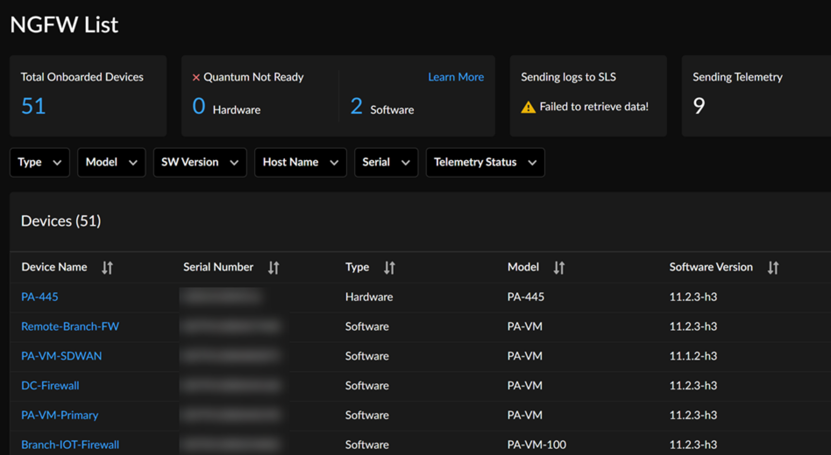 You can filter the devices based on their type, model, software version, host name, serial number and telemetry status. You can also Export the list of devices.