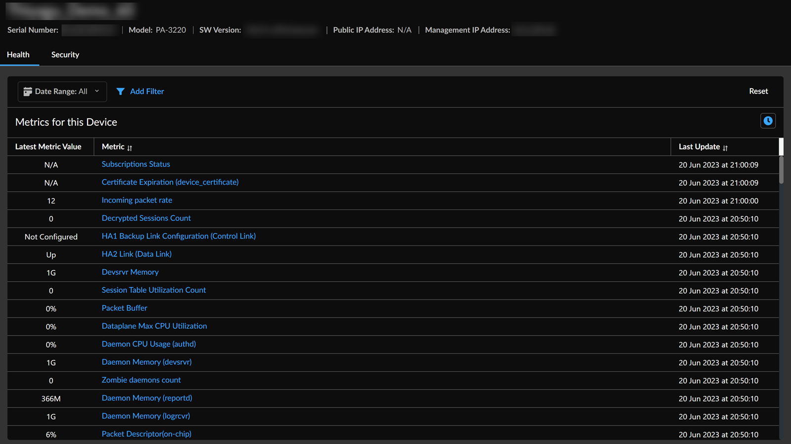 By selecting a device from the NGFW List visualization or by following a link from elsewhere in the app, you can view specific details about a firewall or Panorama appliance, such as health grade, metrics, connections, and more.