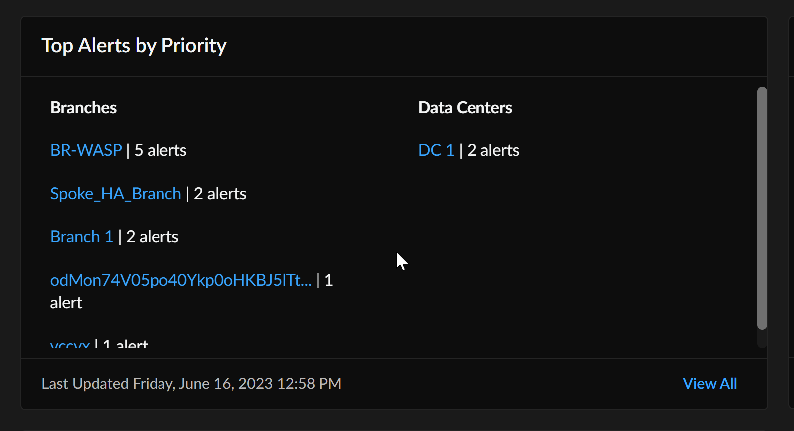 The Top Alerts by Priority widget displays the top 5 alerts by priority. You can see information on the top branch and data center sites by the number of alerts generated in the selected time range. You can drill down to view the alert information per site for the selected time range.