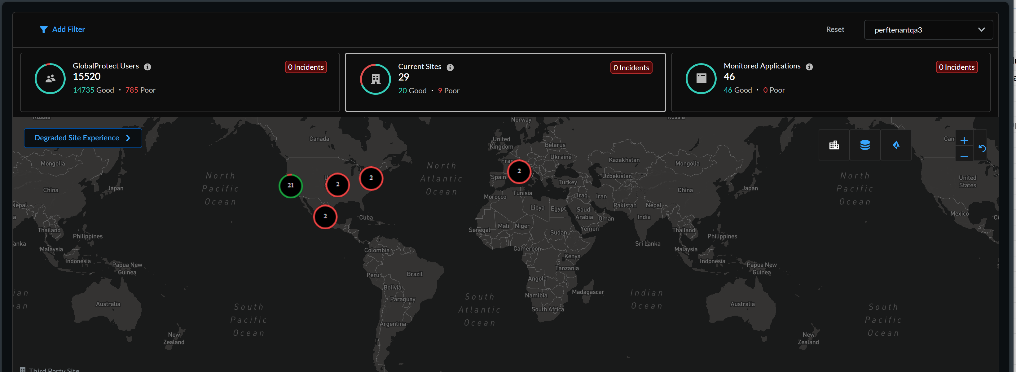 This dashboard shows the number of configured sites connecting to Prisma Access Locations worldwide. The number enclosed in parenthesis is the total number of connected sites and the number to the right is the number of sites that are up with Good experience scores. Sites are considered based on score for SD-WAN or tunnel status and incidents.