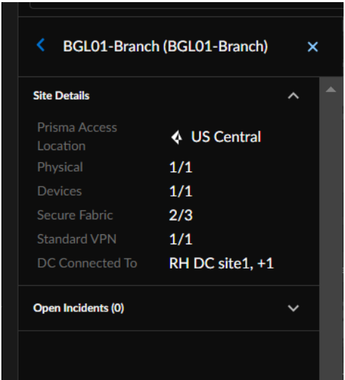 To view the dashboard, navigate to InsightsPrisma SASESASE Health, select Current Sites on the page. Drill down to a specific site to know the site details such as the PA location, DC connected to, standard VPN, secure fabric, and any open incidents.