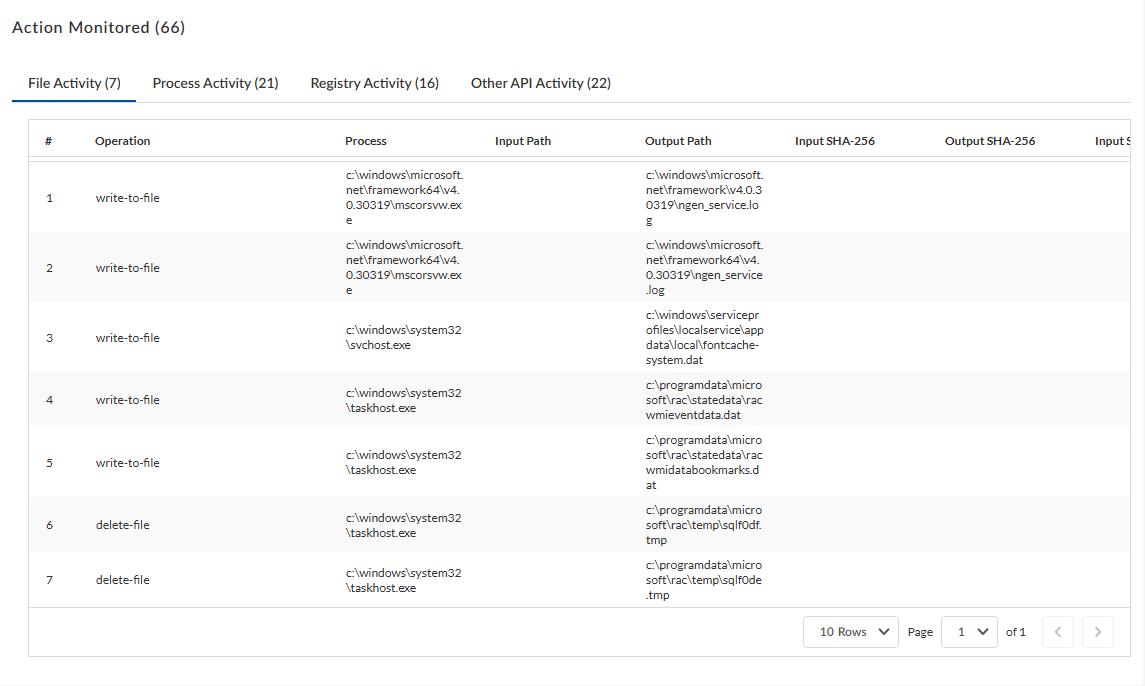 Actions Monitored —Review various sample process activity details that WildFire recorded during sample analysis.