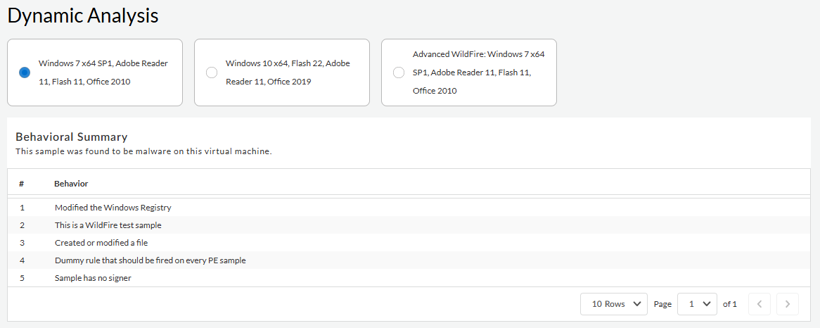 Dynamic Analysis—When WildFire encounters a sample that requires additional analysis, such as an unknown sample, the file is forwarded to the Advanced WildFire cloud an is inspected in detail using WildFire dynamic analysis. You can pivot between the various analysis environments used to view the specific analysis results generated by each. This can include samples analyzed by Advanced WildFire techniques (Intelligent Run-time Memory Analysis analysis, hypervisor Dynamic Analysis, Dependency Emulation, etc.), a cloud-based engine that detects and prevents highly evasive malware threats. You can view the observed behaviors and use this information for post execution analysis. You can check the process activities involved, and the sequence of events that took place in your system while executing the file.