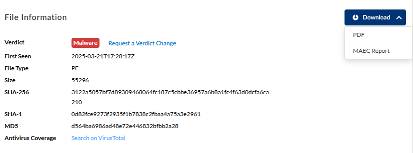 File hash search summarizes the file details in a report based on data generated during WildFire analysis. You can download the report as a PDF or MAEC file in cases where the sample is determined to be malicious, phishing, grayware, or benign. Unknown samples do not generate a report.