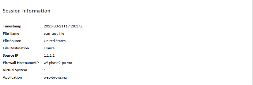 WildFire samples that generate a verdict provide file information and session information at a minimum; while samples that have undergone additional analysis produce specific analysis data that is relevant to actions taken by the sample. You can drill down on the search results to review the following information categories:
