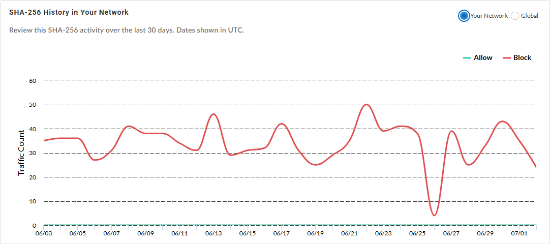 SHA-256 History in Your Network—View the historical prevalence of the specified file hash in your network, and globally, based on the allow and block actions taken by the NGFW.