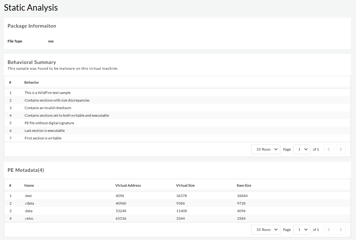 Static Analysis—Static analysis looks at the contents of a specific file before the file is executed in the WildFire analysis environment. This also shows the suspicious file properties, processes, and behaviors detected during static analysis. The search result varies depending on the file type.