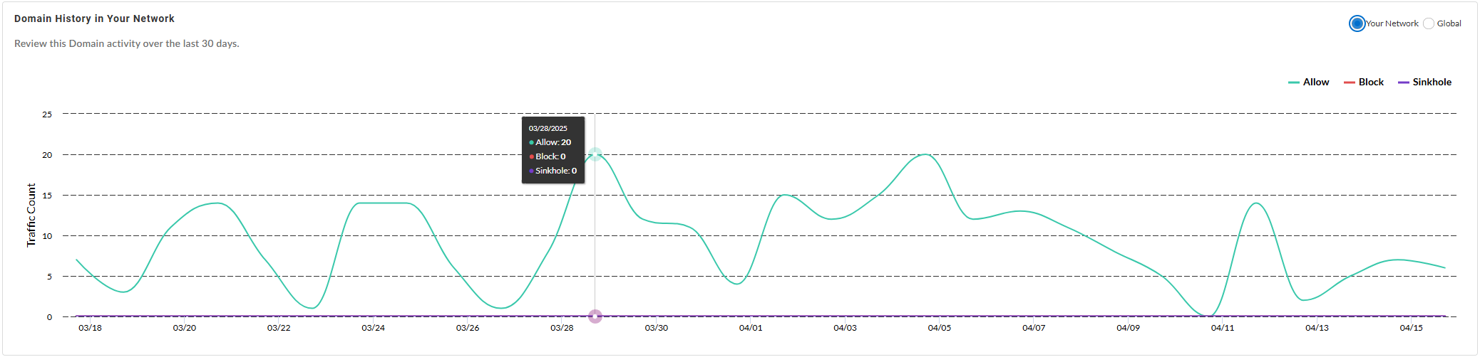 Domain History {in Your Network | Globally}—Shows the number of times the domain was accessed by endpoints in your network (or globally, depending on the widget setting) during the past 30 days.