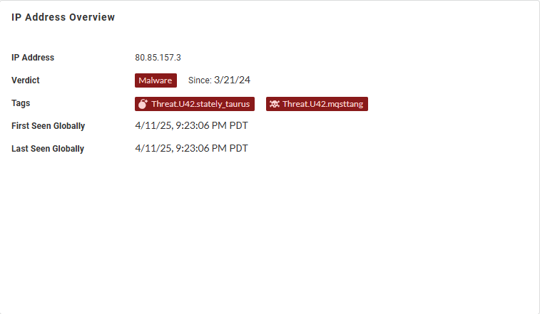 IP Address Overview—View general information about the IP address, including the verdict, associated tags, and, if the IP address has been analyzed previously, the timestamp when it was initially and last observed, globally.
