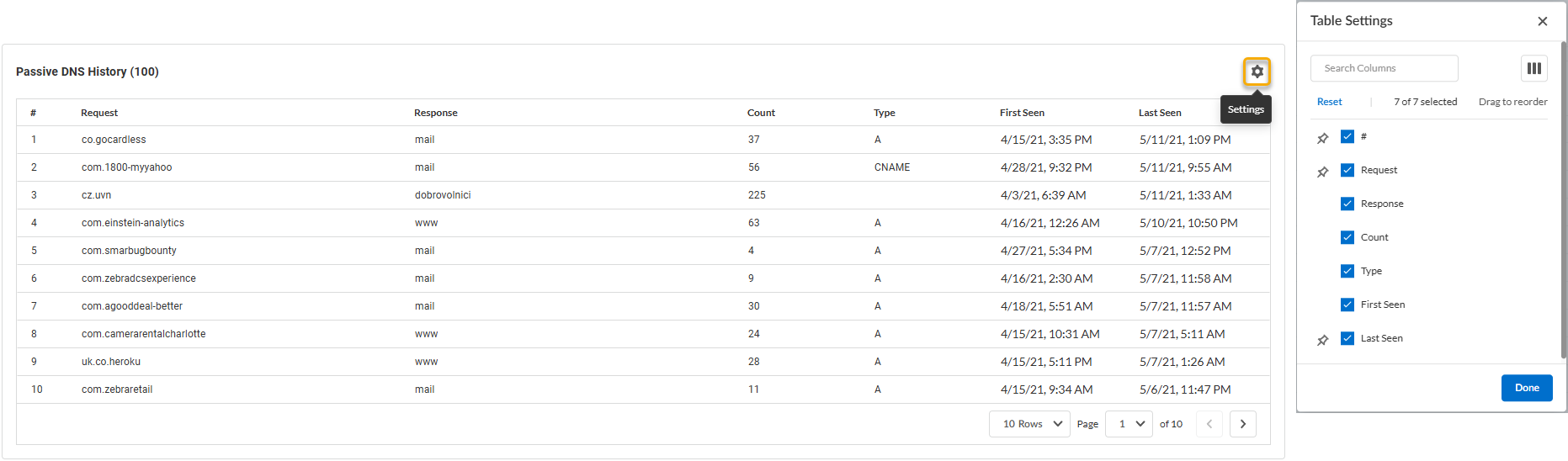 You can configure the fields displayed in the passive DNS history table based on the following fields: