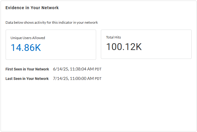 Evidence in Your Network—Learn about detection reasons with timestamps when it was initially and last observed in your network, unique allowed users, and total hits data for the web request.