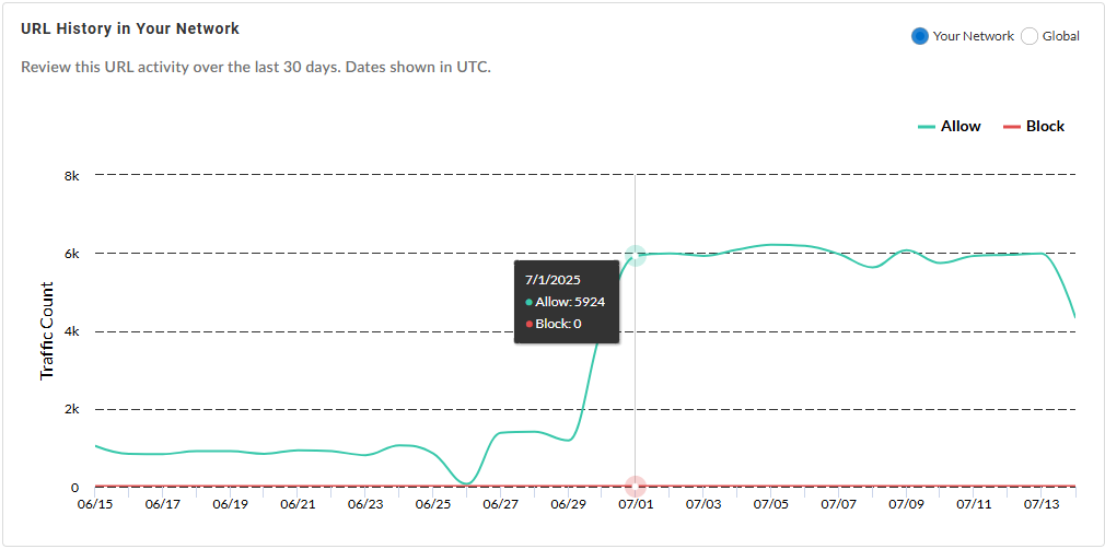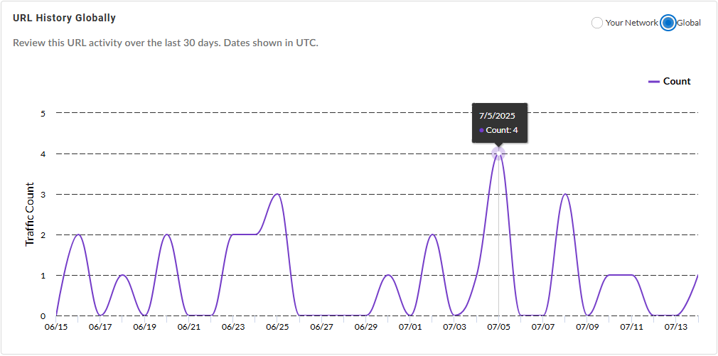 URL History {in Your Network | Globally}—Shows the number of times the URL was accessed by endpoints in your network (or globally, depending on the widget setting) during the past 30 days.