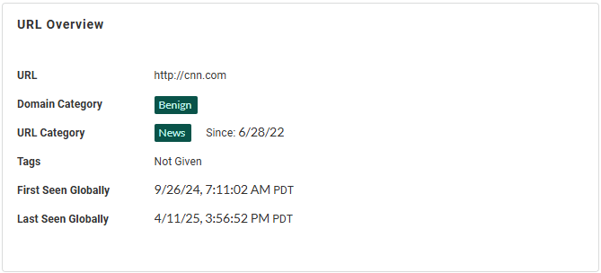 URL Overview—View general information about the URL, including the domain and URL categories as determined by the Advanced DNS Security and Advanced URL Filtering services, respectively, the category tags, and, if the IP address has been analyzed previously, the timestamp when it was initially and last observed, globally.