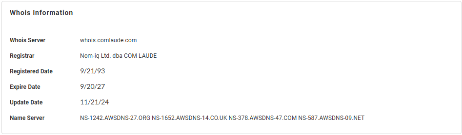 Whois Information —Displays general domain information based on the resource's publicly available registration details.