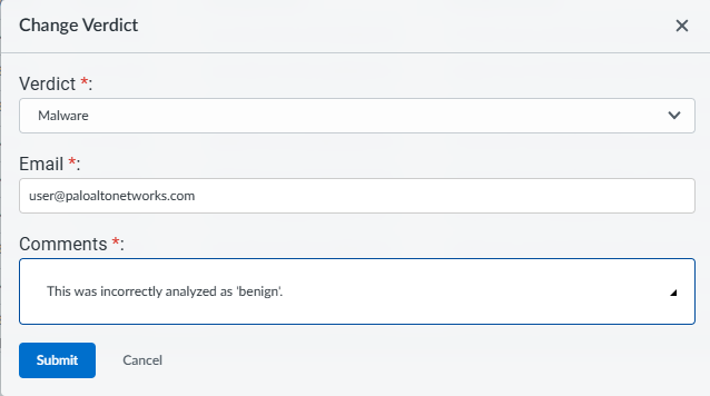 • Report Incorrect Verdict—Verdicts that you suspect are either false positives or false negatives can be submitted to the Palo Alto Networks threat team for additional analysis. The threat team will perform further analysis on the sample to determine if it should be reclassified. If a malware sample is determined to be safe, the signature for the file is disabled in an upcoming antivirus signature update or if a benign file is determined to be malicious, a new signature is generated. After the investigation is complete, you will receive an email describing the action that was taken. You must provide the following details: the recommended verdict, your email address, and any additional comments related to the request.