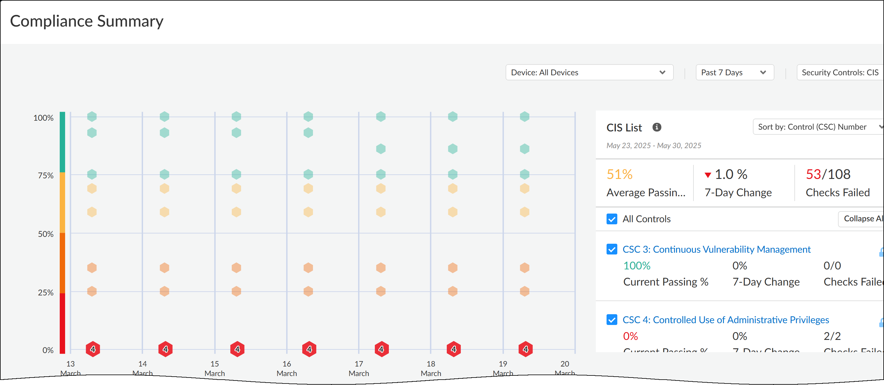 • Check the Compliance Summary dashboard to view a history of changes to the security checks made up to 12 months in the past, grouped together by the Center for Internet Security (CIS) and National Institute of Standards and Technology (NIST) frameworks.