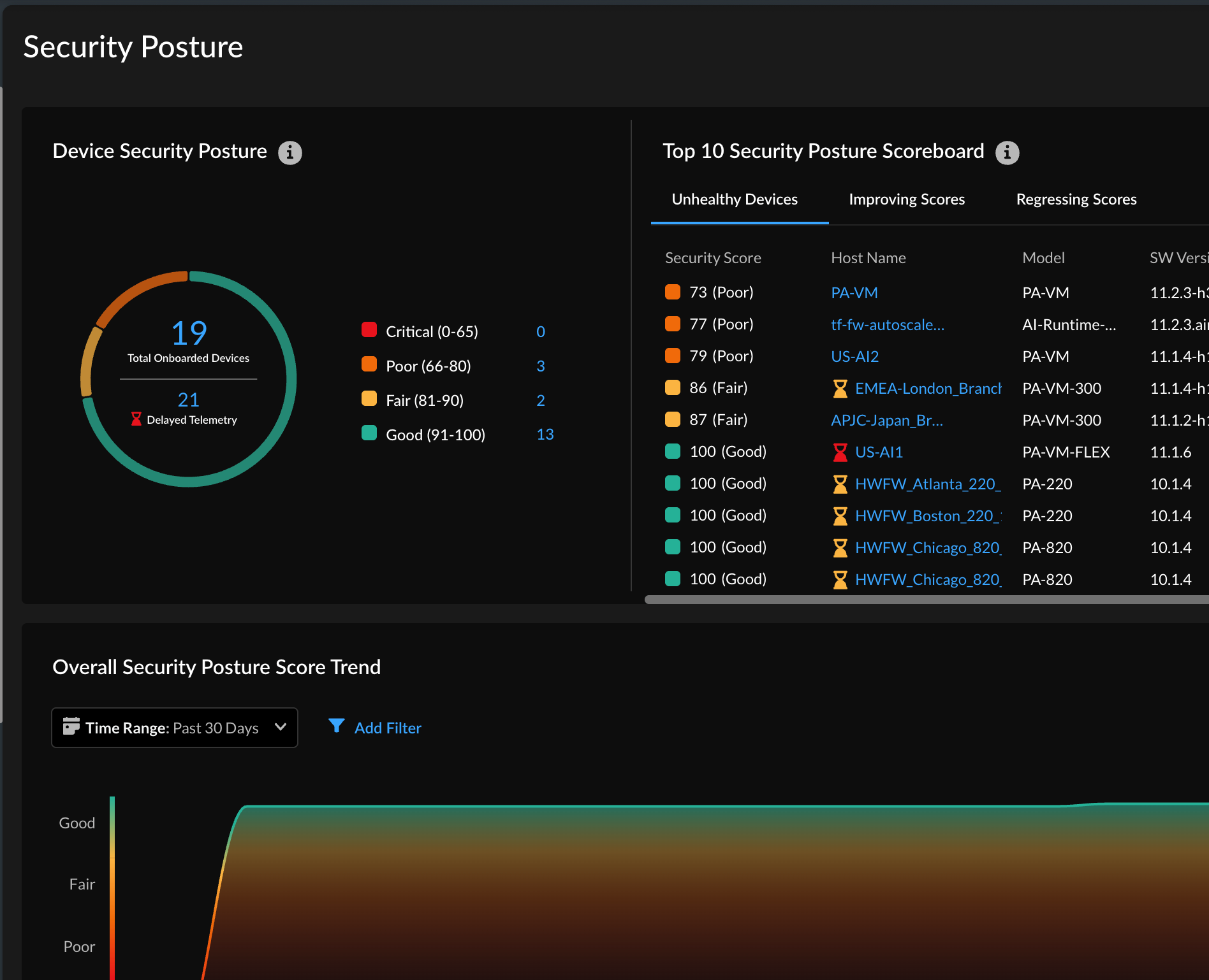 • Get visibility into the security status and trend of your deployment based on the security postures of the onboarded NGFW devices with Insights: Security Posture Insights and be alerted when incidents occur or your security settings may need a closer look.