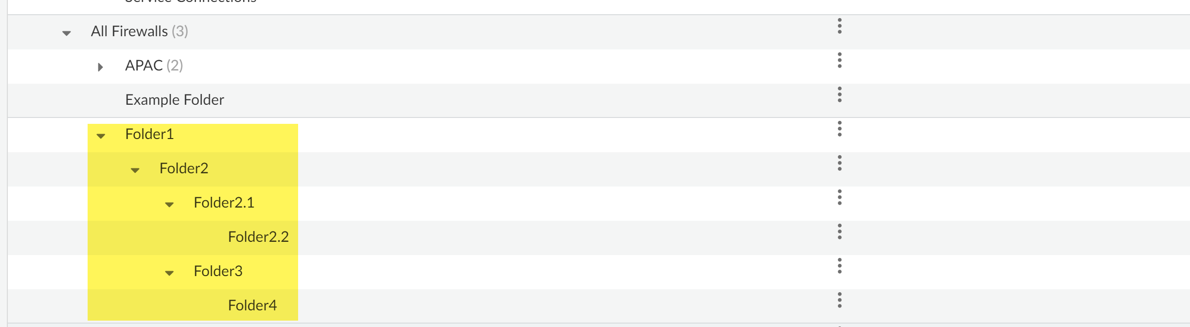 For firewall folders, Strata Cloud Manager supports up to four nested folders within any given folder hierarchy, with the default All Firewalls folder always being the top-most level of any folder hierarchy. For example, consider the below when designing your folder hierarchy. In the example below Folder1, Folder2, Folder3, and Folder4 are nested under the All Firewalls folder and you can’t best any additional folders to this particular folder hierarchy. Additionally, Folder2.1 and Folder2.2 are nested under Folder2 and you can’t add any nest any additional folders either.