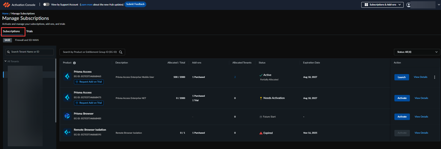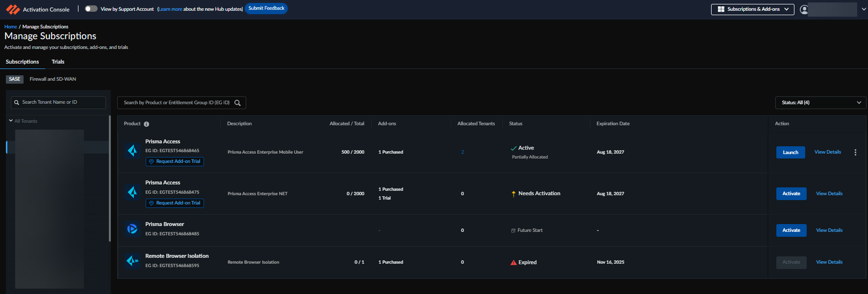 that are activated on this tenant. For activating Next-Generation Firewall (NGFW) and SD-WAN products,