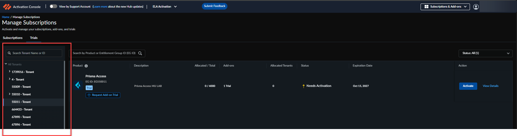tenant, enabling customers to monitor, manage, and activate both purchased and trial