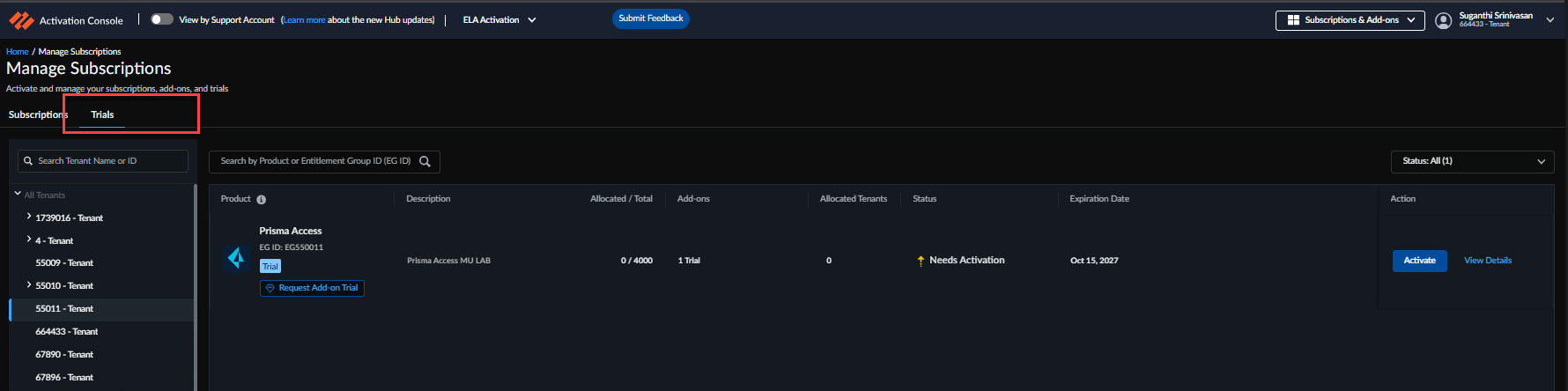 The Trials shows all trials that are ready to activate or have
