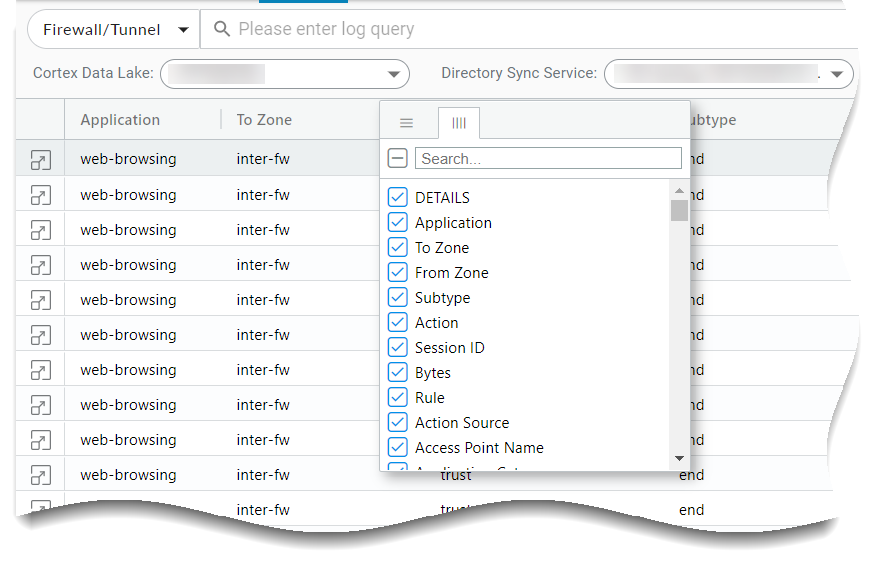 - Identify which fields appear in the log viewer table. Use the Search field to quickly find a specific field. Fields that are checked will appear in the log viewer table.