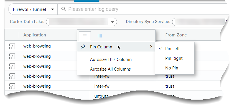 You can change the fields that are displayed in the log table, their order, and which fields are pinned.- To pin the column, click on the menu control in any table column header. In the resulting pop-up, you can configure your table settings. Use Pin Column to control whether the current column is pinned.