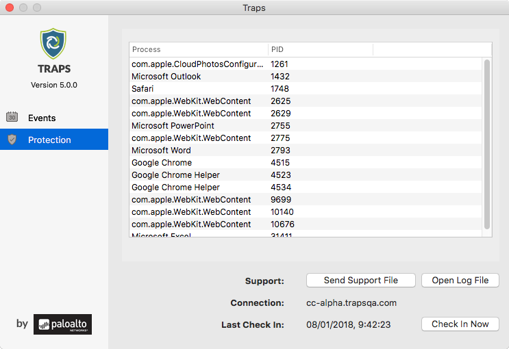 of the Traps console displays all running processes in which Traps