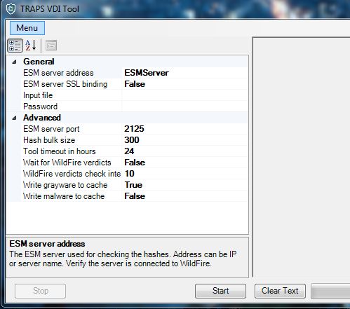 files A command-line version of the Traps VDI tool is also available. See Traps VDI Tool CLI.To ensure that the Traps VDI tool can obtain verdicts for all unknown files, we recommend that you verify the ESM Server can access WildFire (https://wildfire.paloaltonetworks.com).The Traps VDI tool communicates with the ESM Server to request any verdicts the server has stored in its server cache. The Traps VDI tool then creates a WildFire cache which can contain any of the following verdicts for each hash: malicious, benign, or unknown. A hash has an unknown verdict if the ESM Server has not submitted the sample to or received an updated verdict from WildFire.