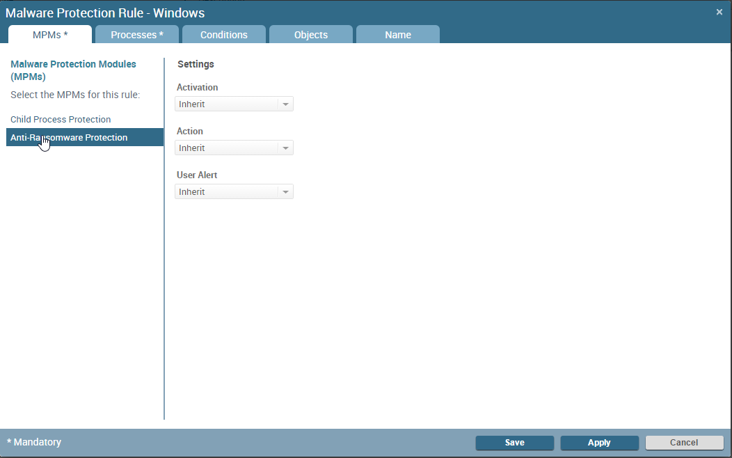 - Activation—Select On to enable anti-ransomware protection or Off to disable protection. In situations where disk encryption software must encrypt files, consider configuring a rule to disable protection on that process.